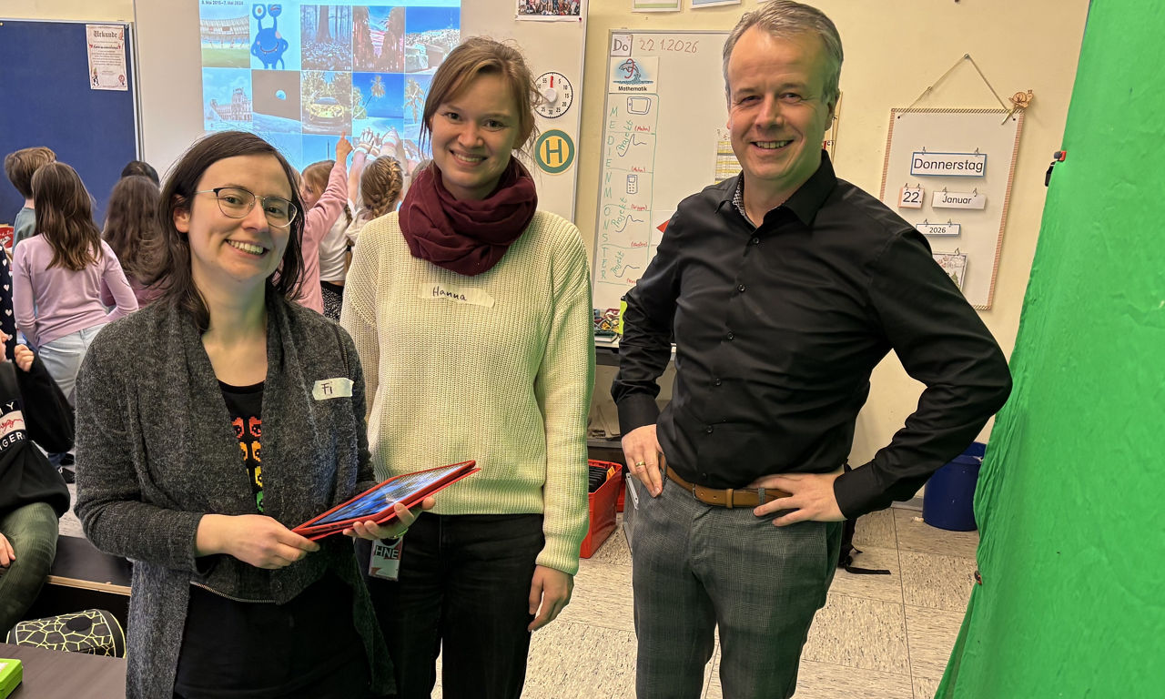 Besonders groß war die Begeisterung zum Ende der Projektstunden: Mithilfe eines Green Screens wurden die Klassen kurzerhand in die Südsee oder in verschneite Landschaften „gebeamt“. Spielerisch erlebten die Kinder dabei, wie leicht Bilder manipulierbar sind – ein eindrucksvoller Lerneffekt, der nachhaltig wirkte.